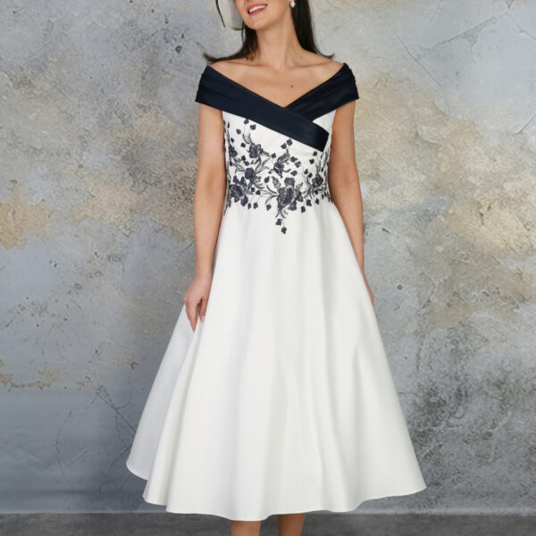 FOC: matching satin sleeves have been added to complement the fine pleated body of this beautiful dress. The flowing jersey skirt and body are all lined to keep you looking perfect all day long, while delicately detailed embroidery with tiny clear sequins add the finishing touches.