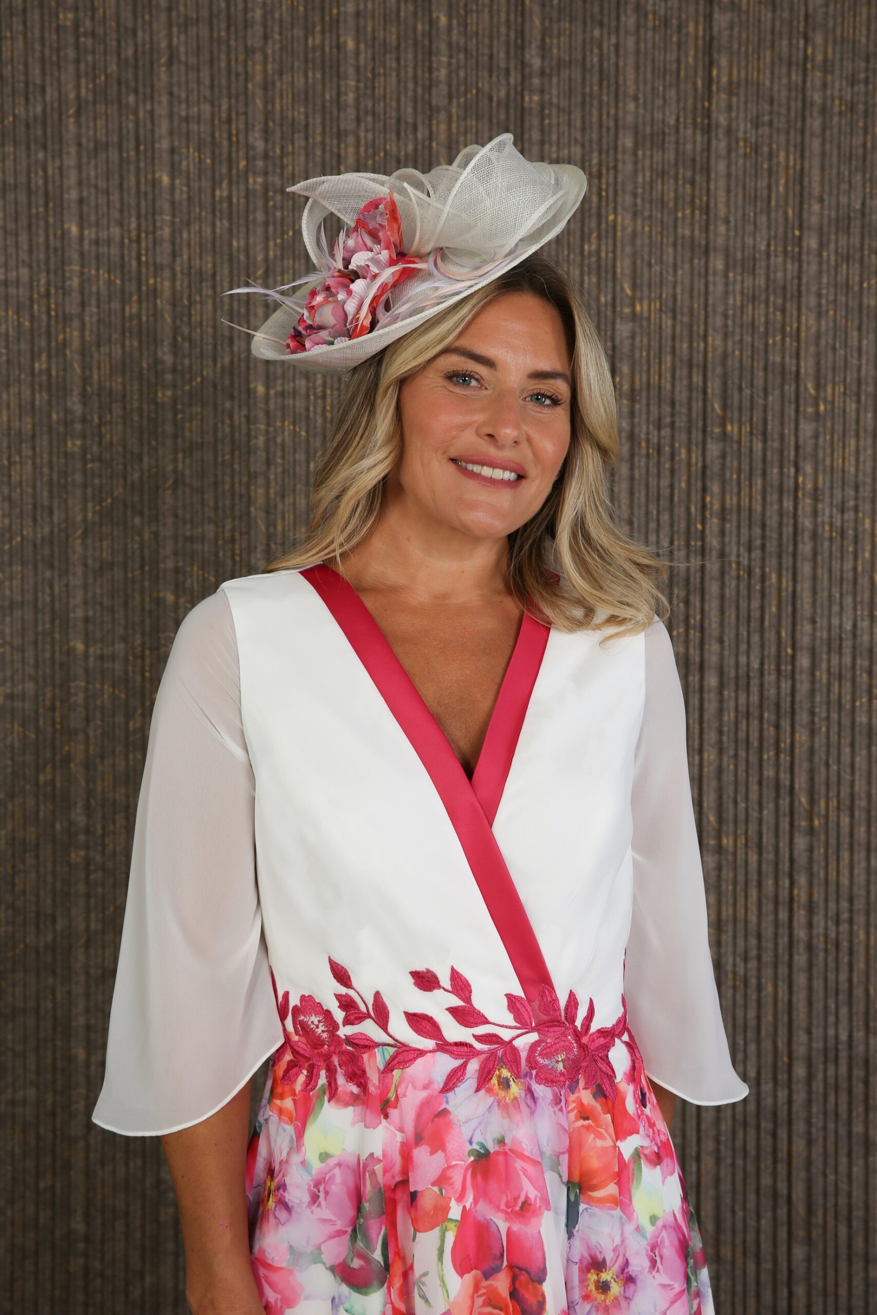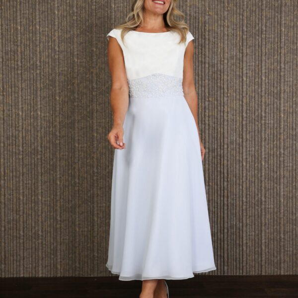 Gently flowing, this is the ultimate style for a slimming and body lengthening appearance. Fine Silk White Chiffon forms the body, with contrast longer length skirt all double lined to keep you looking wonderful from day to evening. Dreamy sleeves are semi-sheer Chiffon to keep you cool, falling just below the elbow.