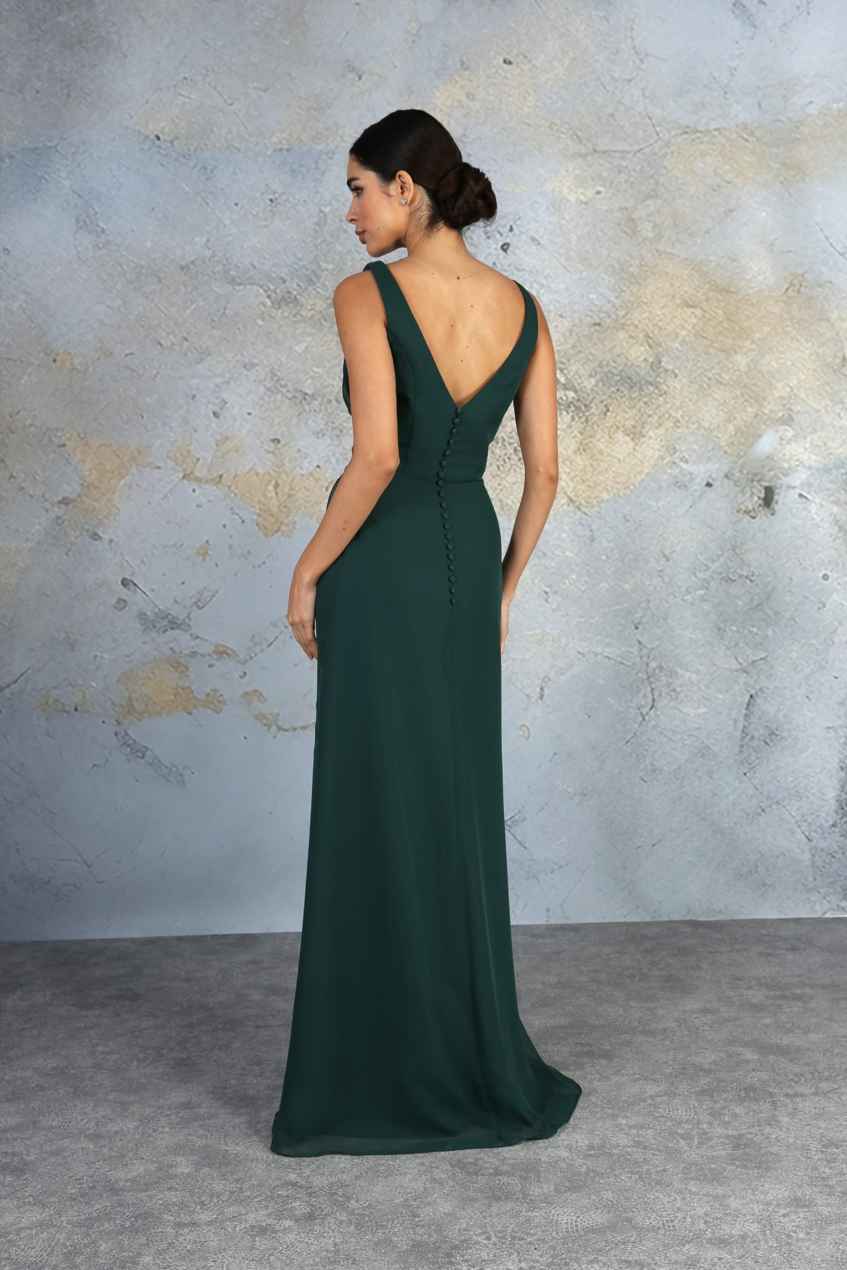 A beautiful chiffon dress with soft pleating that creates a flattering draped shape over the bust. The back of the dress features a gorgeous deep V-shape showcasing your back which leads down to delicate buttons. Pictured in Hunter Green, this dress is available to order in 53 chiffon colours.