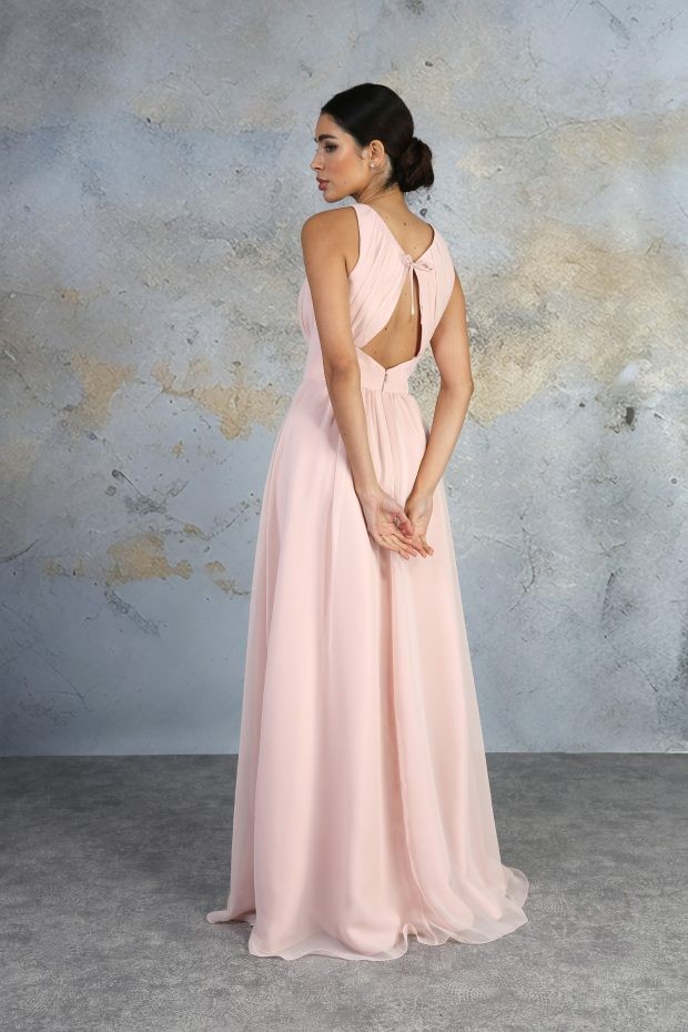 A stunning chiffon bridesmaid dress with super flattering gathers to the bust that along with the wide waistband really emphasise your figure. The A-line skirt drapes elegantly to the floor. The back of the dress features a cute cut-out and tie-up detail. This dress is pictured in Rose and is available to order in 53 chiffon colours.